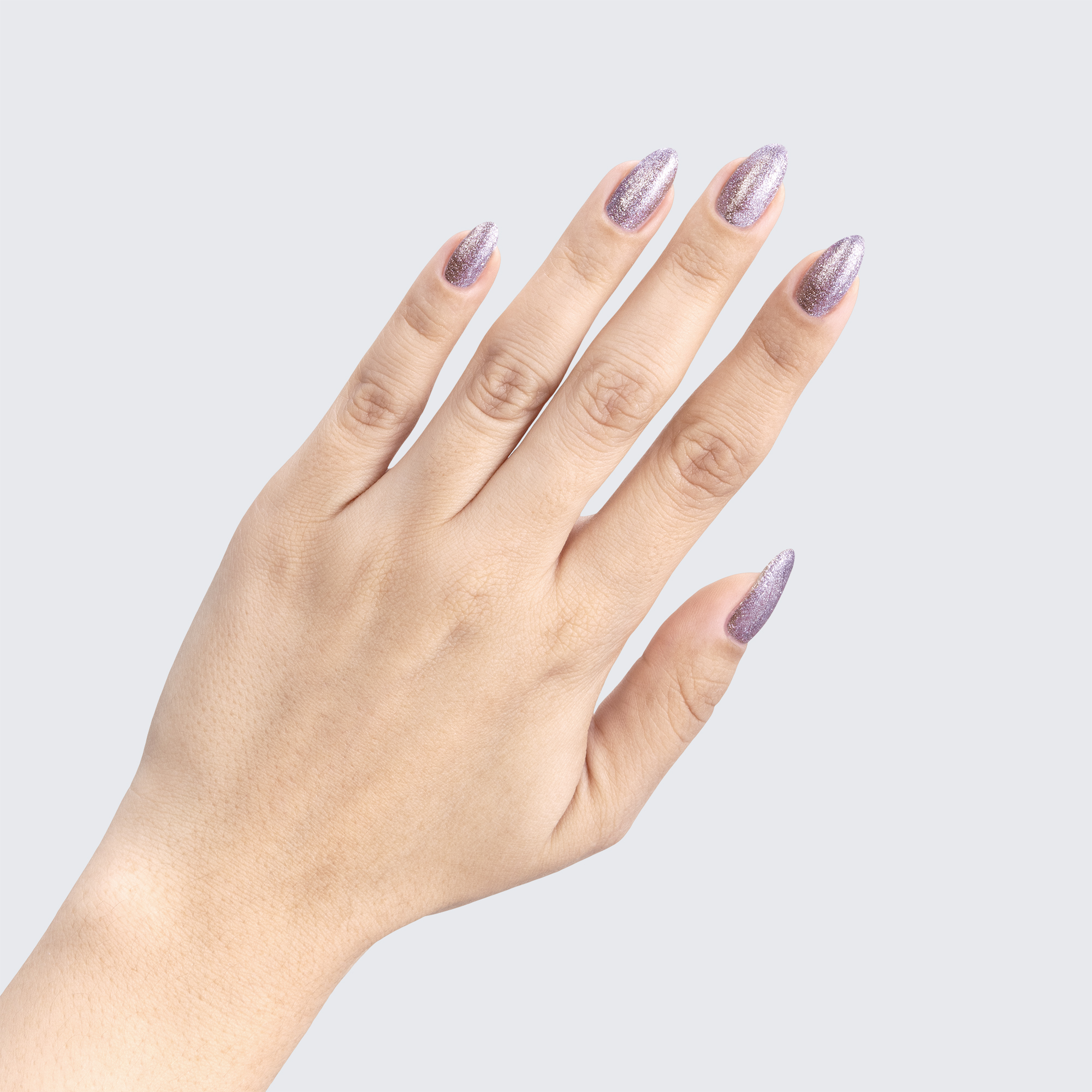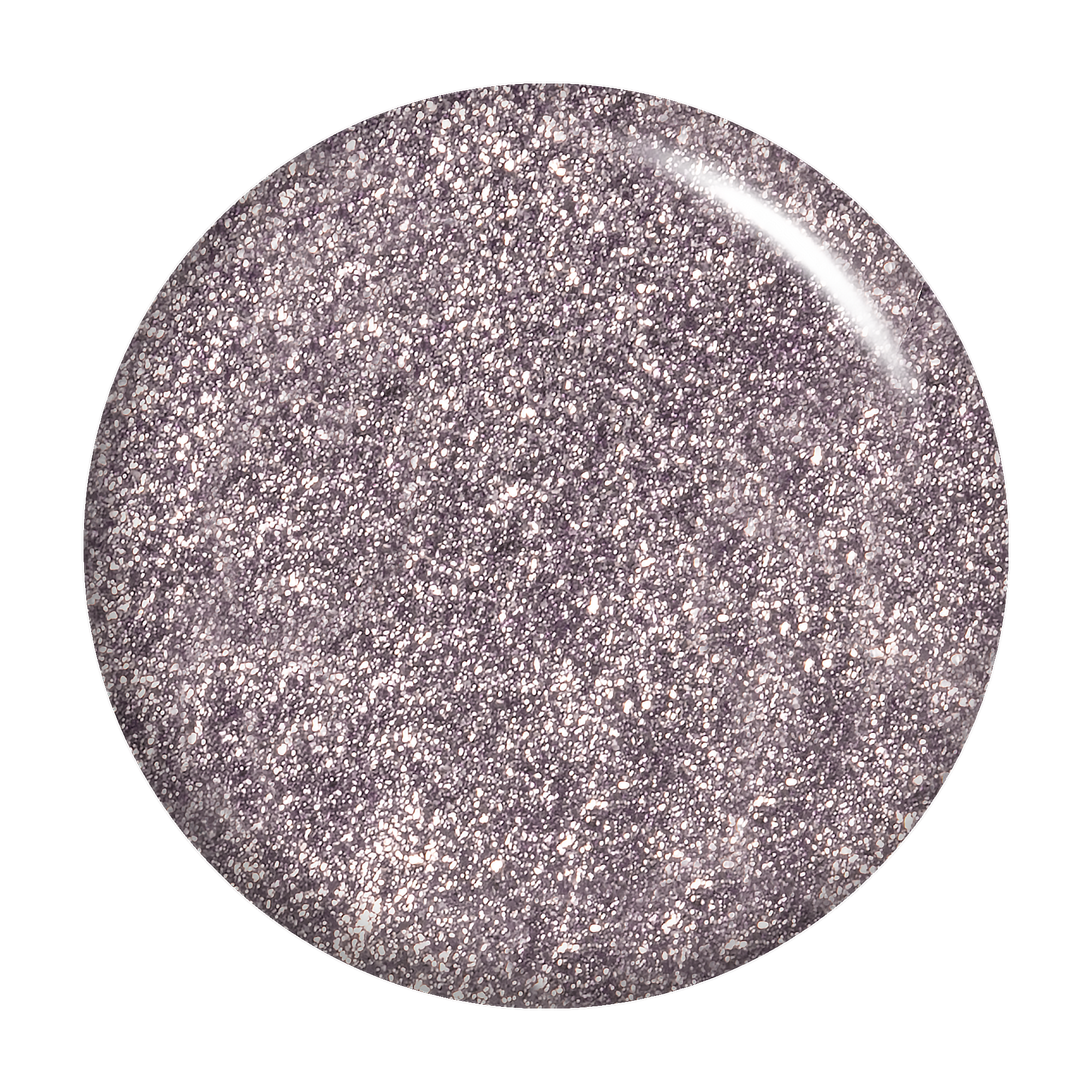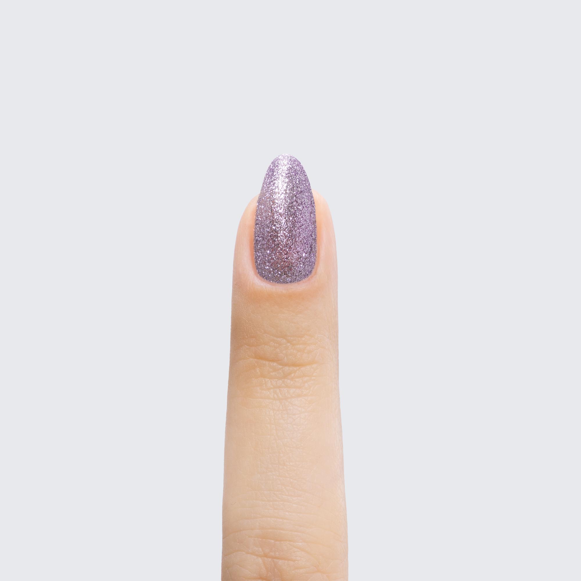 Pale lavender. Metallic foil sparkle. Opaque. Cool undertone.