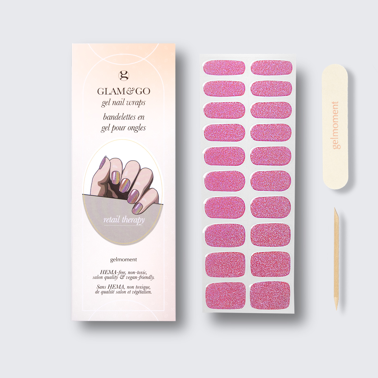 Plus, not only do GLAM & GO gel nail wraps provide the same glossy finish you know and love from our regular gel polish, but they are also HEMA FREE and have a wear time of up to 14+ days.